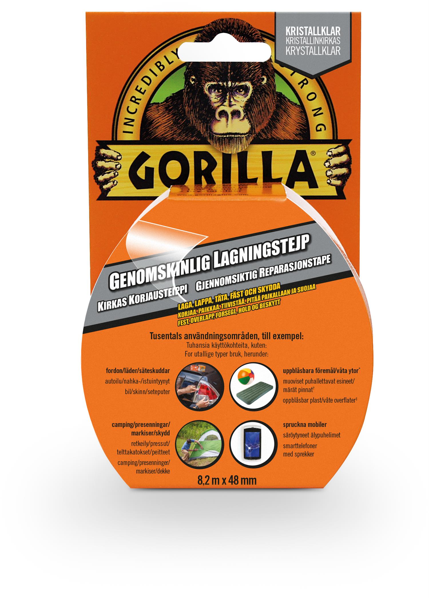 Gorillatape krystallklar er utrolig sterk og perfekt for praktisk tal usynlige reparasjoner. Effektiv i reparasjoner av telt, gummimadrasser og dunjakker. Gulner ikke over tid.